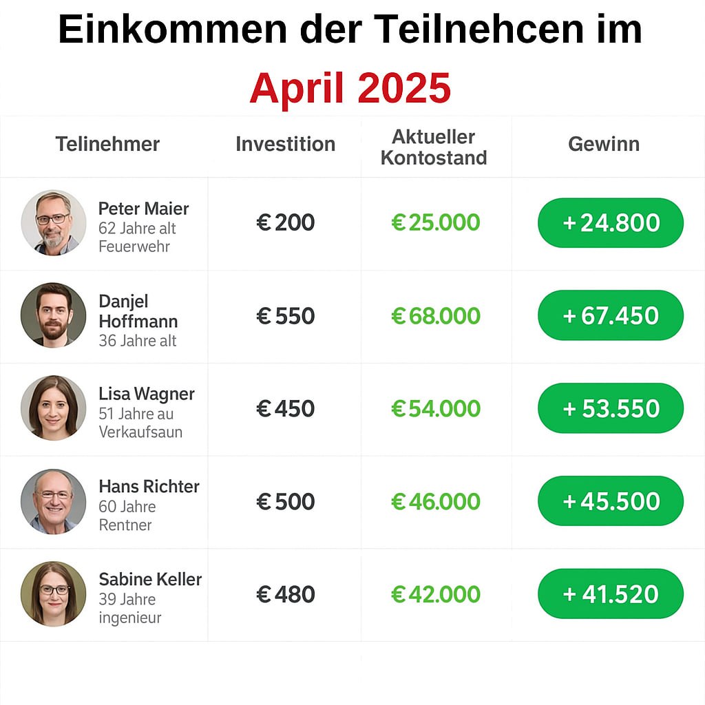 „Ich war erst skeptisch, aber nach einem Tag hatte ich bereits über 400 € auf meinem Konto“, erzählt Markus S. (48) aus Dresden. Andere berichten von 2.000 bis 3.000 € in der ersten Woche – mit einem einmaligen Startbetrag von nur 250 €.